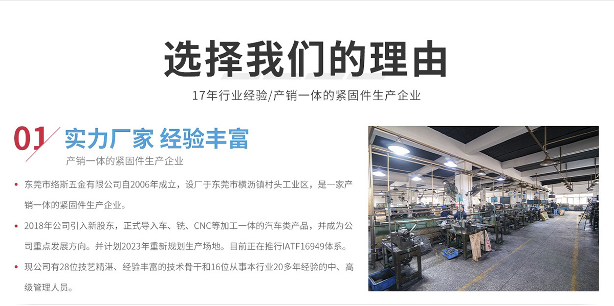 東莞市絡斯五金有限公司自2006年成立,設廠于東莞市橫瀝鎮村頭工業區,是一家產銷一體的專業緊固件生產企業。